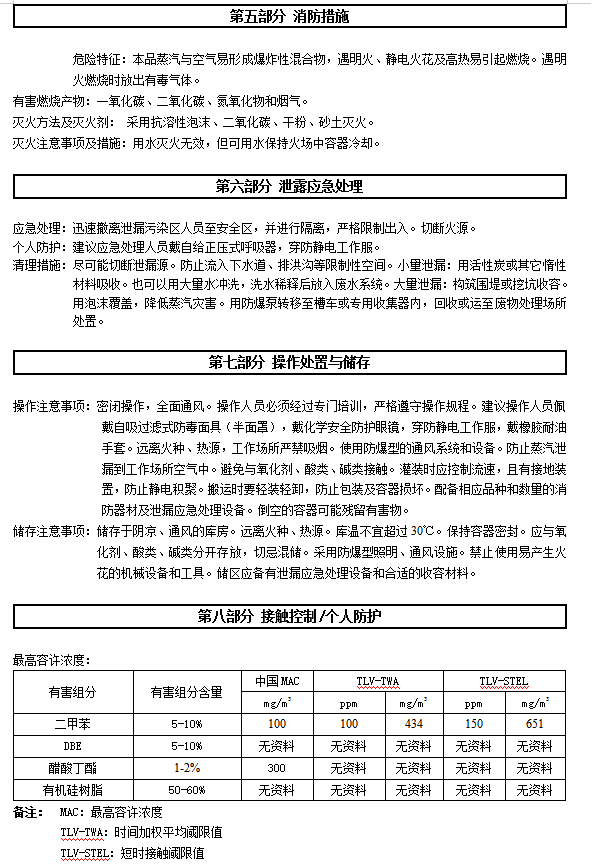 會引起眼睛和皮膚的刺激。反應(yīng)的蒸汽可能會引起過敏人群的呼吸道刺激??赡軙鹌つw過敏反應(yīng)。避免呼吸蒸汽。請勿觸及眼睛、皮膚。要使用眼、耳、皮膚的防護(hù)用具,使用合適的面具,以避免潛在的呼吸道刺激。使用后用清水徹底的清洗皮膚。如有不適請咨詢醫(yī)生。衣物再次使用前要洗滌。如果沒有呼吸要進(jìn)行人工呼吸,最好嘴對嘴,并請醫(yī)生處理。灼傷:放熱反應(yīng)會使產(chǎn)品變熱,超出正常水平。在混合后要小心處理。使用手套。急救:如果不慎接觸了眼睛,立即用清水沖洗至少 15 分鐘,并脫去污染的衣鞋,用肥皂清洗接觸后的皮膚。